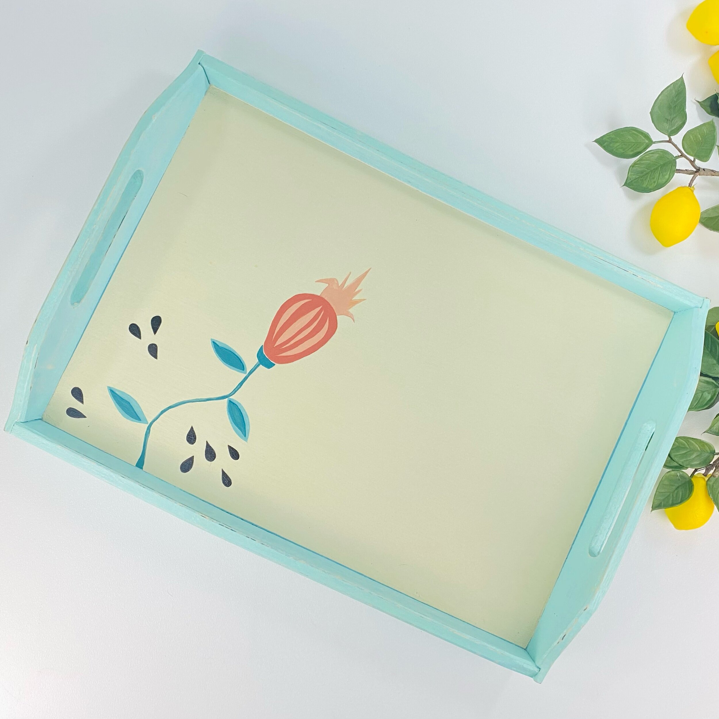 Whether it's tea time or happy hour, this upcycled vintage wood tray makes it a lively presentation. Hand-painted, artful detail on top was inspired by the poppies, pods and pretty birds on the paper lining the bottom side.