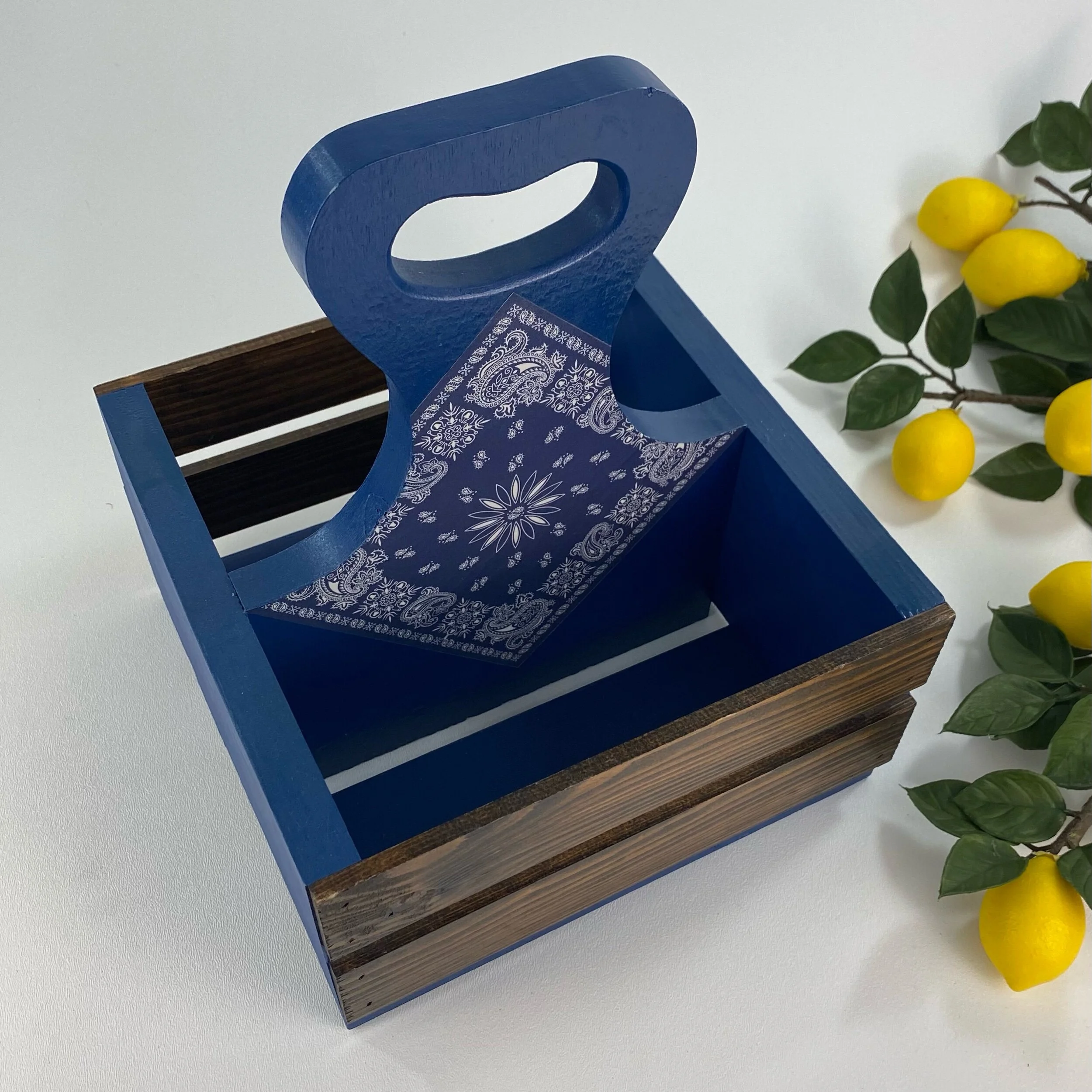 Denim is classic Americana - but fits right in with any vintage, boho, western flavor too! The navy bandana print adds pop to this traditional wood tote.